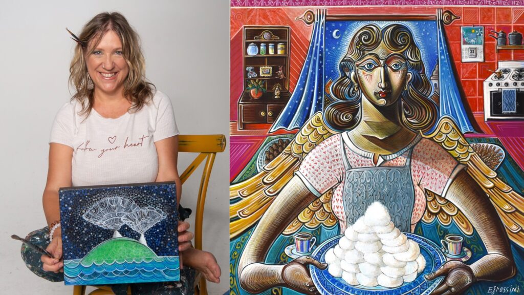The debut design features Angel Cook by Efrossini Chaniotis, a Greek-Australian artist whose work merges mythology, storytelling, and vivid visual expression. Based in Melbourne, Efrossini studied sculpture and performance art in Adelaide, painting in Athens and Madrid, earning two Fine Art degrees and later a Master’s in Art Therapy. Her studio—affectionately called Little Mykonos—is a kaleidoscope of color and creativity, where she paints, sculpts, and explores how art heals, connects, and transforms.